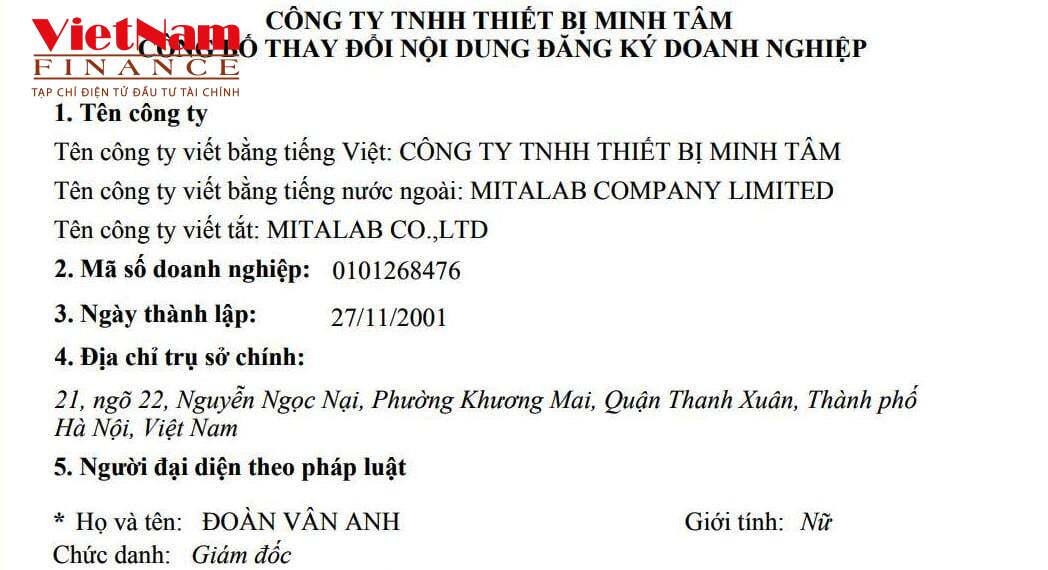 Bà Đoàn Vân Anh là người đại diện pháp luật kiêm giữ chức danh giám đốc công ty. Số lao động đăng ký của Công ty Thiết bị Minh Tâm ở mức 138 người.