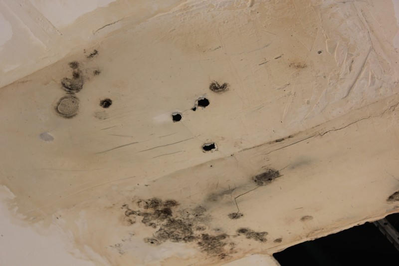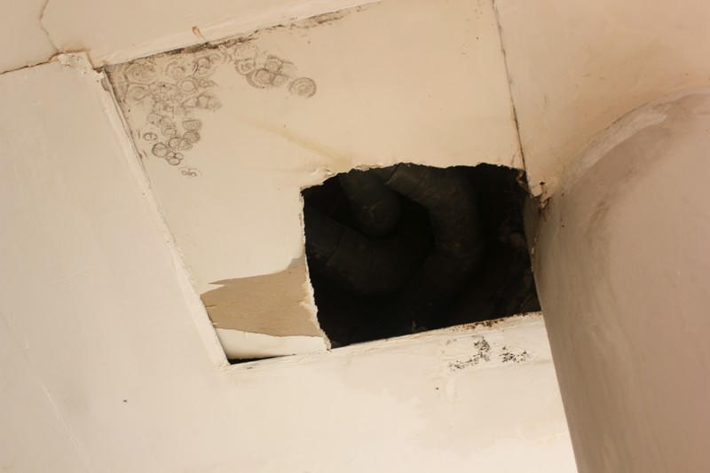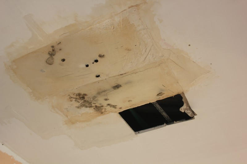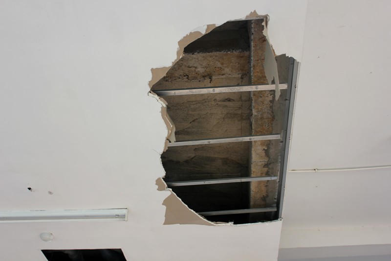 Tình trạng trần thạch cao của tòa nhà bị “sập” mất 1 mảng xuất hiện phổ biến tại khu vực tầng 1 nhiều tòa nhà. |