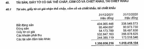 Với dư nợ cho vay vào cuối năm 2021 ở mức 960.750 tỷ đồng, bình quân mỗi đồng cho vay của Vietcombank được đảm bảo bởi 1,70 đồng tài sản thế chấp, riêng bất động sản là 1,21 đồng.