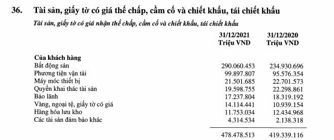 Ngân hàng quy mô nhỏ hơn như VIB cũng có lượng giá trị bất động sản thế chấp của khách hàng tăng 14% so với cuối năm 2020, ghi nhận hơn 478.478 tỷ đồng. Trong đó, bất động sản thế chấp tăng 23% ghi nhận hơn 290.000 tỷ đồng, chiếm 61% tổng tài sản cầm cố tại nhà băng này. Tốc độ tăng trưởng bất động sản thế chấp còn cao hơn cả mức tăng trưởng tín dụng tại VIB (19%).