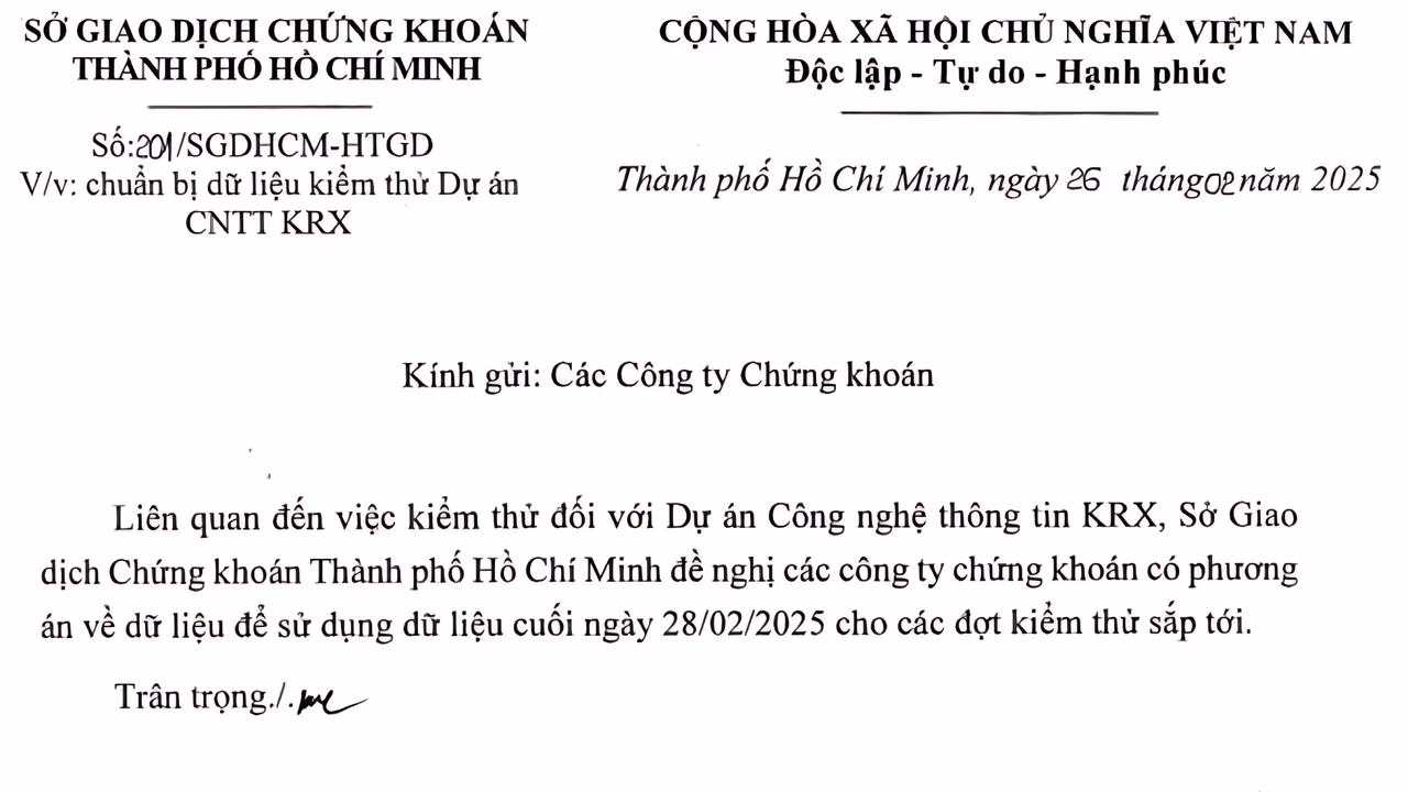“Liên quan đến việc kiểm thử đối với dự án công nghệ thông tin KRX, Sở Giao dịch Chứng khoán TP. Hồ Chí Minh đề nghị các công ty chứng khoán có phương án về dữ liệu để sử dụng dữ liệu cuối ngày 28/2/2025 cho các đợt kiểm thử sắp tới”, văn bản nêu.