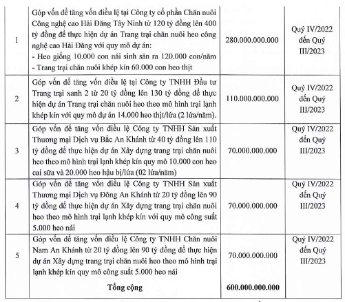 Cùng với đó, công ty dùng 40 tỷ đồng góp vốn để tăng vốn điều lệ Công ty TNHH Đầu tư Trang trại xanh 1 từ 40 tỷ đồng lên 80 tỷ đồng; 30 tỷ đồng góp vốn để tăng vốn điều lệ Công ty TNHH Chăn nuôi Bảo Ngọc từ 20 tỷ đồng lên 50 tỷ đồng và 30 tỷ đồng góp vốn để tăng vốn điều lệ Công ty TNHH Anh Vũ Phú Yên từ 50 tỷ đồng lên 80 tỷ đồng.