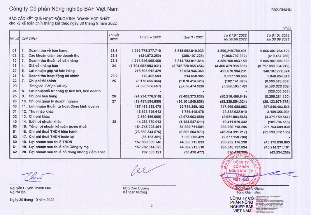 Trong quý II/2022, Nông nghiệp BaF Việt Nam ghi nhận doanh thu đạt 1.625,24 tỷ đồng, giảm 41,2% so với cùng kỳ và lợi nhuận sau thuế đạt 40,42 tỷ đồng, giảm 62,6% so với cùng kỳ. Trong đó, biên lợi nhuận gộp giảm từ 5,1% về còn 4,1%.