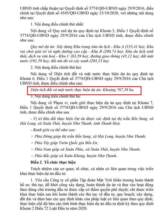 Cụ thể, quy mô dự án sau khi được điều chỉnh gồm: Xây dựng Khu trung tâm du lịch – Khu A (153,41 ha); Khu vui chơi giải trí và nghỉ dưỡng cao cấp – Khu B (200,74 ha); Khu du lịch sinh thái, dịch vụ văn hoá – Khu C (63,59 ha); đường giao thông (45,12 ha); đất mặt nước (101,59 ha); đất núi đá và cây xanh (203,13 ha). Vị trí khu đất thực hiện đự án được xác định tại thị trấn Bến Sung, xã Hải Long, xã Xuân Thái, huyện Như Thanh. Diện tích đất và mặt nước thực hiện dự án khoảng 767,58 ha.