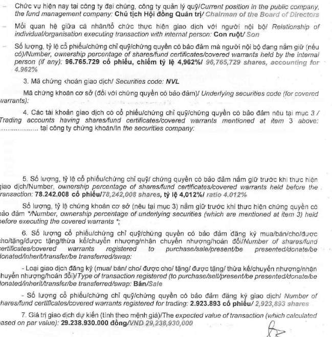 Theo đó, trong thời gian từ ngày 21/3 đến 18/4, ông Bùi Cao Nhật Quân là người nội bộ, sẽ bán ra 2,92 triệu cổ phiếu NVL, giảm tỉ lệ sở hữu từ 78,24 triệu (tương ứng 4,012%) xuống còn 76,31 triệu cổ phiếu, chiếm 3,86%. Giá trị giao dịch dự kiến theo mệnh giá là 28,23 tỷ đồng.