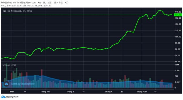 Trên thị trường chứng khoán, cổ phiếu NVL đã tăng gấp đôi giá sau gần 5 tháng qua đó đạt đỉnh 142.000 đồng/cổ phiếu (ngày 20/5) trước khi điều chỉnh nhẹ về mức 134.900 đồng/cổ phiếu như hiện nay. Với mức thị giá hiện tại, vốn hóa thị trường của Novaland đã xấp xỉ 156.688 tỷ đồng (khoảng 6,8 tỷ USD), xếp thứ 11 trên sàn. Nếu cổ phiếu NVL tiếp tục duy trì xu hướng tăng tích cực, Novaland hoàn toán có thể lọt top 10 doanh nghiệp giá trị nhất sàn chứng khoán trong thời gian tới.