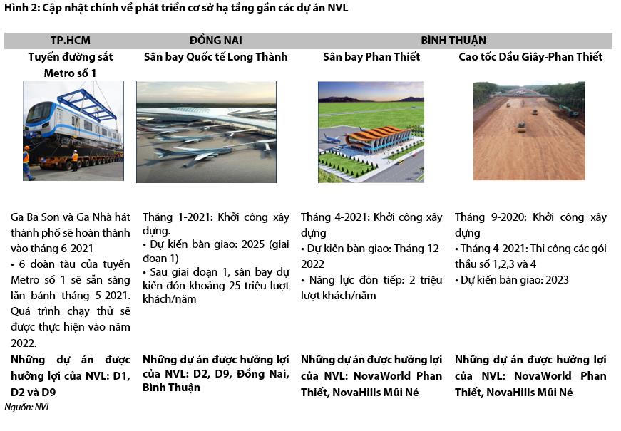 VDSC cho rằng, giai đoạn 2021-2024 sẽ là giai đoạn ghi nhận kết quả kinh doanh tích cực đối với Novaland. Các yếu tố xúc tác chính bao gồm: Việc mở bán và bàn giao tốt tại ba dự án BĐS nghỉ dưỡng ở các khu vực vệ tinh. Các nút thắt về pháp lí đang dần được tháo gỡ khi một số luật/nghị định đã bắt đầu có hiệu lực ngay trong năm 2021 giúp đẩy nhanh tiến độ ghi nhận doanh thu lợi nhuận tại các dự án ở TP.HCM trong thời gian tới. Chuyển biến tích cực của các dự án cơ sở hạ tầng lân cận sẽ hỗ trợ về giá và tỷ lệ hấp thụ cho dự án của Novaland.