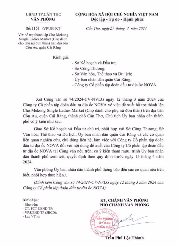 Chủ tịch UBND TP. Cần Thơ giao Sở Kế hoạch và Đầu tư chủ trì, phối hợp với Sở Công Thương, Sở Văn hóa - Thể thao và Du lịch, UBND quận Cái Răng và các cơ quan liên quan nghiên cứu, chủ động liên hệ, làm việc với Tập đoàn NOVA đối với nội dung đề xuất của doanh nghiệp.