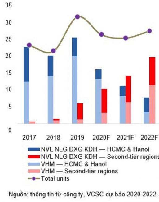 Với việc khu vực ven Hà Nội và TP. Hồ Chí Minh đang ngày càng sôi động, VCSC dự báo lượng giao dịch căn hộ sơ cấp tại Hà Nội và TP. Hồ Chí Minh sẽ tăng nhẹ vào năm 2021. Cụ thể, điển hình như một số đại gia địa ốc như Novaland, Nam Long, Vinhomes,… sẽ duy trì mức doanh số bán hàng nhờ vào việc chuyển tập trung sang các khu vực vùng ven.