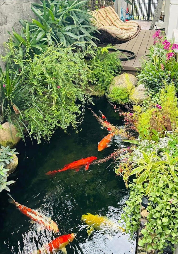 Tại khu vườn, vợ chồng cô còn thiết kế thêm một hồ cá Koi, tạo không gian thư giãn lý tưởng.