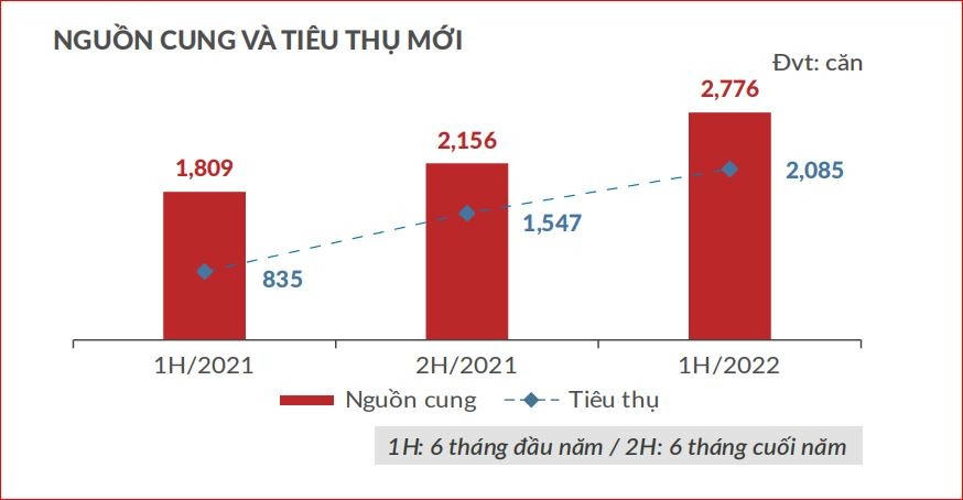 Lượng tiêu thụ cũng ghi nhận tín hiệu tích cực khi có 3.848 căn được bán, tương đương 75% nguồn cung mới, cao hơn 2,6 lần svck 2021 nhưng giảm 15% so với 2 quý cuối năm 2021.
