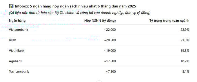 Theo số liệu từ Bộ Tài chính, tổng thu ngân sách nhà nước 6 tháng đầu năm 2025 đạt hơn 1,3 triệu tỷ đồng, bằng 66,2% dự toán năm. Trong đó, ngành ngân hàng là một trong những khu vực nộp ngân sách lớn nhất, với khoảng 95.500 – 96.000 tỷ đồng, chiếm tỷ trọng đáng kể trong nhóm các ngành tài chính – dịch vụ.