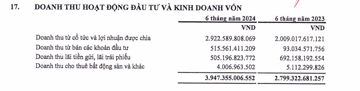 Doanh thu từ cổ tức và lợi nhuận được chia cũng tăng 25%, lên mức 2.922 tỷ đồng. Ở chiều ngược lại, doanh thu từ lãi tiền gửi và đầu tư trái phiếu bất ngờ giảm 27%, đạt 505,2 tỷ đồng.
