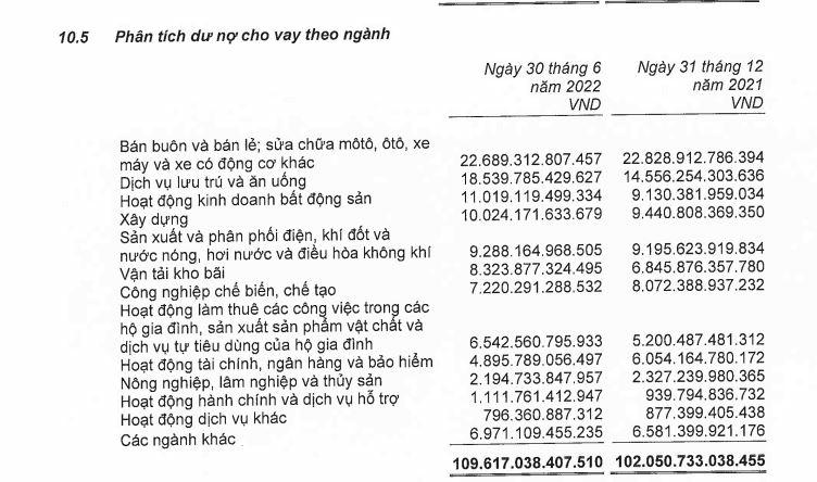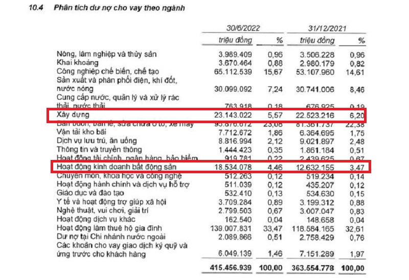 Tại ngân hàng nhỏ như VietBank, tính đến cuối quý 2/2022 dư nợ cho vay khách hàng hơn 56.222 tỷ đồng và hơn 11.114 tỷ trong đó là cho vay kinh doanh bất động sản và 2.931 tỷ đồng là cho vay xây dựng.