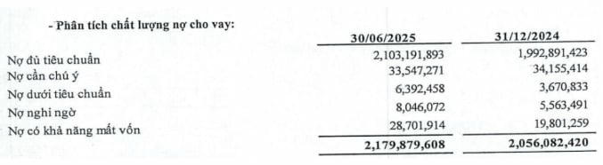 Tuy nhiên, chất lượng tín dụng có dấu hiệu suy giảm khi tổng nợ xấu nhóm 3, 4, 5 đã lên tới hơn 43.100 tỷ đồng, cao hơn đáng kể so với mức hơn 29.000 tỷ đồng vào cuối năm trước. Tỷ lệ nợ xấu cũng tăng từ mức 1,41% đầu năm lên 1,98%.