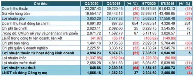 Tổng doanh thu thuần hợp nhất trong sáu tháng đầu năm đạt 38.576 tỷ đồng – giảm 36,8% so với cùng kỳ năm trước, chủ yếu do không còn ghi nhận doanh thu từ hoạt động bán lẻ, và ảnh hưởng tiêu cực từ dịch Covid-19. Tuy nhiên, doanh thu từ hoạt động sản xuất tăng mạnh đã bù đắp một phần cho sự suy giảm.