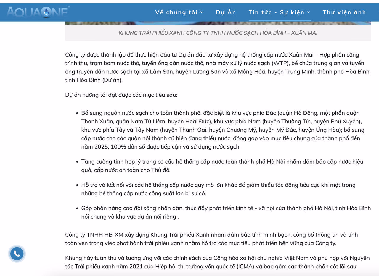 “Khung Trái phiếu xanh này được Công ty TNHH Xuân Mai – Hòa Bình xây dựng nhằm đảm bảo tính minh bạch, công khai và toàn vẹn trong việc phát hành trái phiếu xanh nhằm hỗ trợ các mục tiêu phát triển bền vững của công ty,” trích khung trái phiếu xanh của Nước sạch Hòa Bình - Xuân Mai.