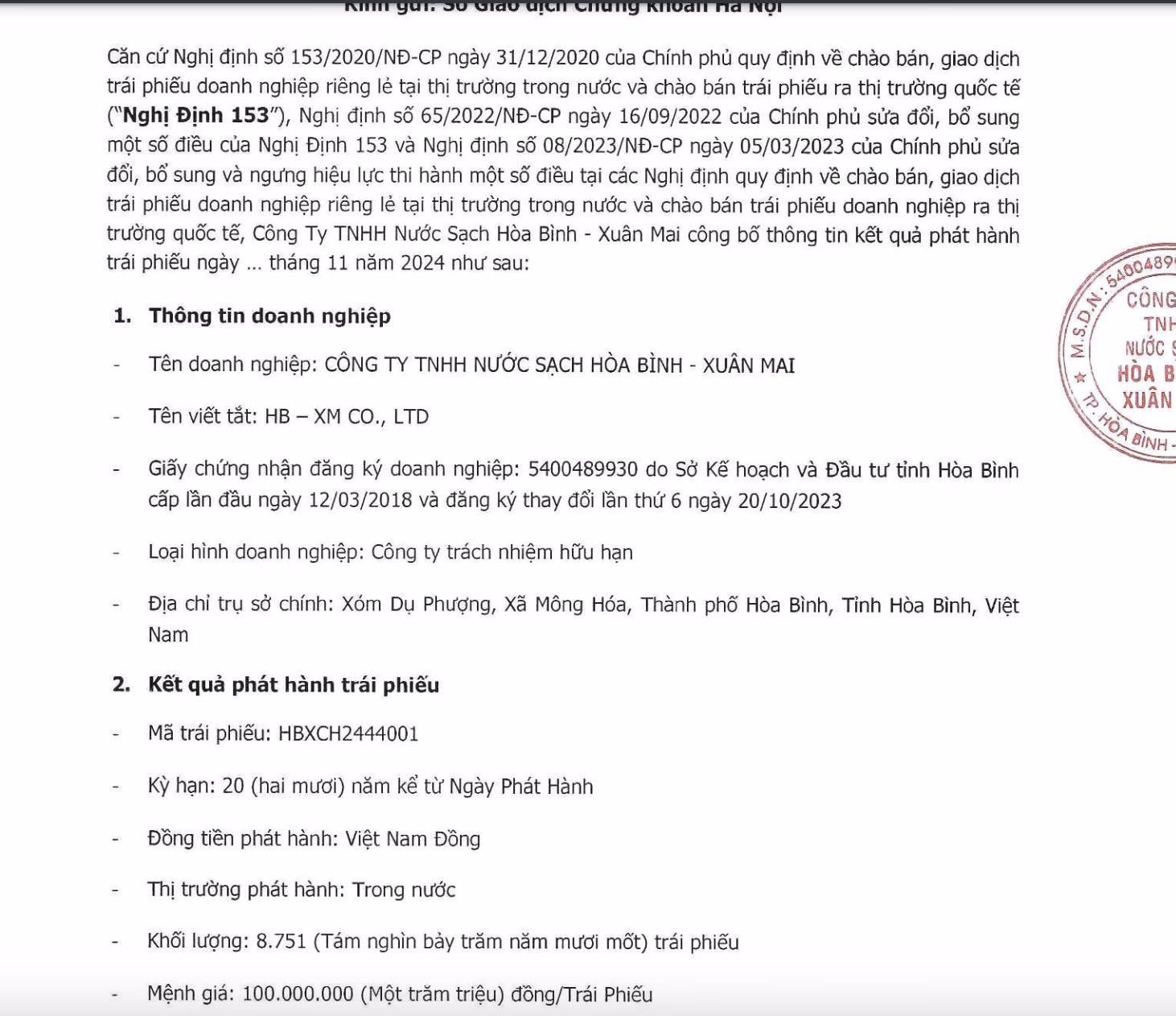 Công ty TNHH Nước sạch Hòa Bình - Xuân Mai vừa có kết quả phát hành trái phiếu gửi Sở Giao dịch Chứng khoán Hà Nội. Từ ngày 19/11 - 27/11, công ty này đã chào bán thành công 8.781 trái phiếu mã HBXCH2444001, với mệnh giá 100 triệu đồng/TP, Nước sạch Hòa Bình - Xuân Mai đã huy động thành công hơn 875 tỷ đồng từ lô trái phiếu nói trên.