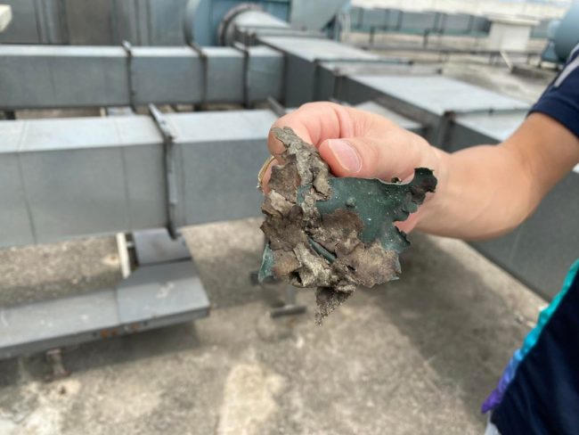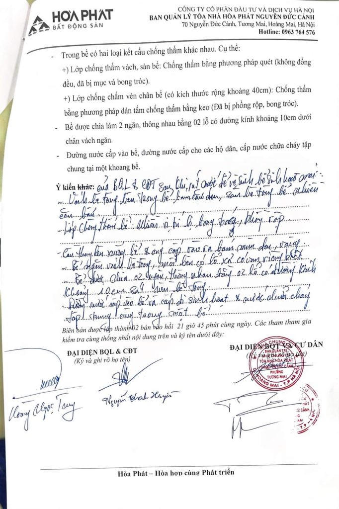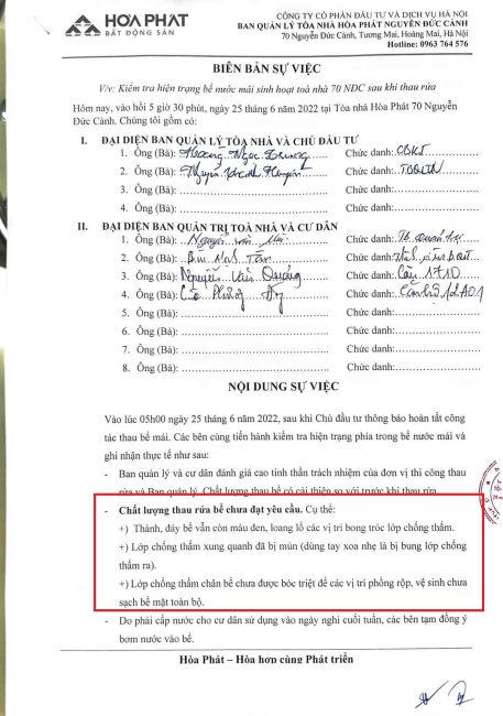 Theo biên bản sự việc, sau khi chủ đầu tư thông báo hoàn tất công tác thau rửa bể ngầm (tầng hầm), các bên cùng tiến hành kiểm tra hiện trạng bể, hệ thống đường ống trong bể nước ngầm ghi nhận; trần bể còn các đầu thép buộc trong quá trình thi công bị hoen gỉ chưa được loại bỏ, toàn bộ trần bể, thành bể và đáy bể không có lớp vữa bảo vệ lớp chống thấm và lớp gạch ốp lát như quy định theo bản vẽ thiết kế được thẩm tra, lớp chống thấm tiếp xúc trực tiếp với nước sinh hoạt.