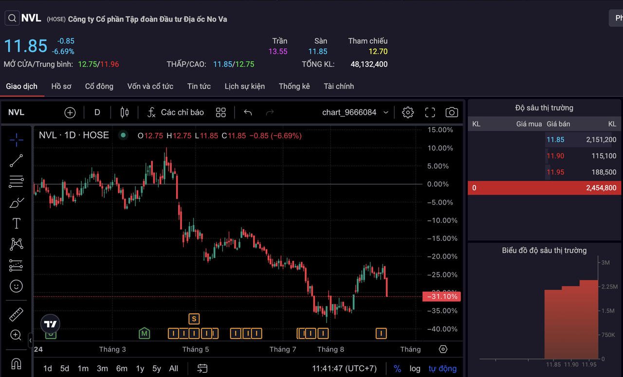 Trước thông tin bị cắt margin, cổ phiếu NVL trên thị trường ngay lập tức phản ứng một cách mạnh mẽ khi rơi xuống mức giá sàn, giảm kịch biên độ còn 11.850 đồng/cổ phiếu.
