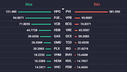 Khoảng thời gian đầu phiên, các chỉ số có sự trồi sụt liên tục khi nhóm cổ phiếu vốn hóa lớn phân hóa mạnh, dù vậy biến động này của các chỉ số đều ở trong sắc xanh. Đà tăng được củng cố sau đó khi nhóm cổ phiếu ngân hàng “nhập cuộc”, các mã như MBB, CTG, ACB, MSB, LPB... đồng loạt tăng giá mạnh. Chốt phiên, MBB tăng đến 3,3%, CTG tăng 3,2%, ACB tăng 2,6%, MSB tăng 2,2%.
