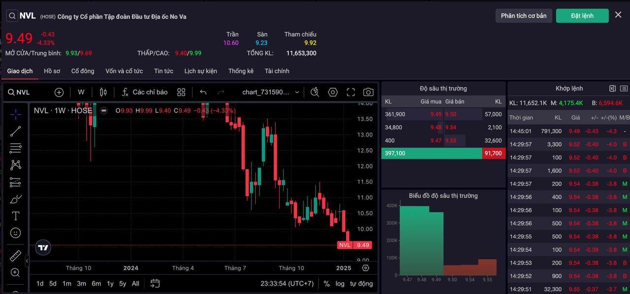 Kết thúc phiên giao dịch ngày 13/1, cổ phiếu NVL của Công ty CP Tập đoàn Đầu tư Địa ốc Nova (Novaland) đóng cửa ở mức 9.490 đồng/cp, giảm 4,33% so với tham chiếu. Dưới góc độ kỹ thuật, mã này đang trong trạng thái tiêu cực khi “thủng” đáy tháng 3/2023 – mức giá thấp nhất kể từ khi niêm yết.