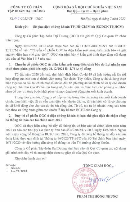 Về việc duy trì cổ phiếu OGC ở diện chứng khoán bị hạn chế giao dịch do chậm công bố thông tin báo cáo tài chính năm 2021. OGC cho biết, công ty đã thực hiện công bố đầy đue thông tin về báo cáo tài chính kiểm toán năm 2021 và báo cáo với UBCKNN. Ngoài việc chậm công bố thông tin BCTC 2021, Công ty đã công bố đầy đủ các nội dung khác theo quy định.