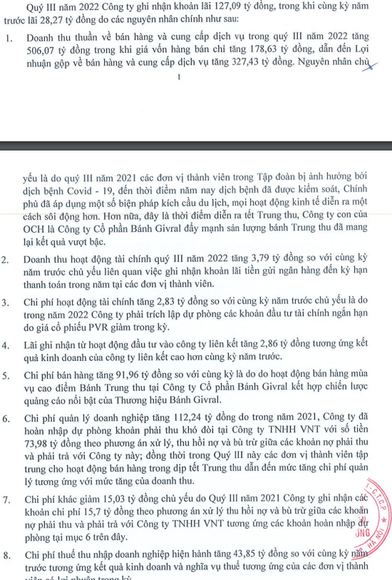 Trước đó, trong báo cáo tài chính năm 2021, OGC cho rằng, trong quý III các đơn vị thành viên trong tập đoàn bị ảnh hưởng bởi dịch bệnh Covid-19, đến năm nay, dịch bệnh đã được kiểm soát, Chính phủ có các biện pháp kích cầu du lịch, mọi hoạt động kinh tế diễn ra sôi động hơn. Đồng thời, quý III cũng là mùa vụ tết Trung thu, công ty con của OCH là CTCP Bánh Givral đẩy mạnh sản lượng bánh trung thu đã mang đến kết quả vượt bậc.