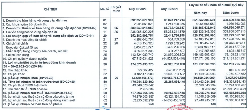 Theo báo cáo tài chính hợp nhất quý III/2022 của Ocean Group, doanh thu hợp nhất hơn 592 tỷ đồng, tăng vọt so với con số 85 tỷ đồng cùng kỳ, trong khi đó, giá vốn hàng bán tăng chậm hơn, nên lợi nhuận gộp ghi nhận gần 353 tỷ đồng, tăng 12,8 lần so với quý III/2021, biên lợi nhuận gộp gần 60% cải thiện đáng kể so với con số 30% cùng kỳ.