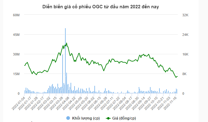 Trên thị trường, giá cổ phiếu OGC rơi sâu từ vùng 15.900 đồng hồi nửa cưới tháng 9/2022 về mức 7.030 đồng thị giá – kết phiên giao dịch ngày 18/11. Trước đó, từ ngày 10 – 16/11, nhóm cổ phiếu này đã ghi nhận 5 phiên giảm sàn liên tiếp kéo thị giá về mức 6.420 đồng.