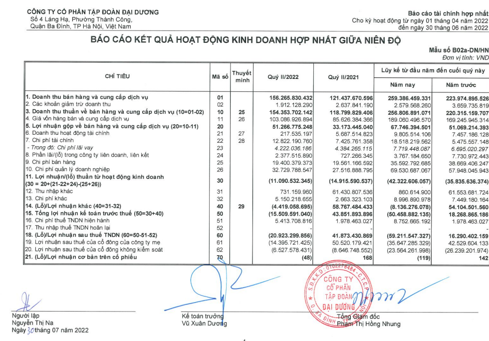 Theo BCTC hợp nhất quý II/2022 mới được công bố, CTCP Tập đoàn Đại Dương (Ocean Group, HOSE: OGC) ghi nhận doanh thu thuần từ bán hàng và cung cấp dịch vụ tăng 30% so với cùng kỳ lên 154 tỷ đồng.
