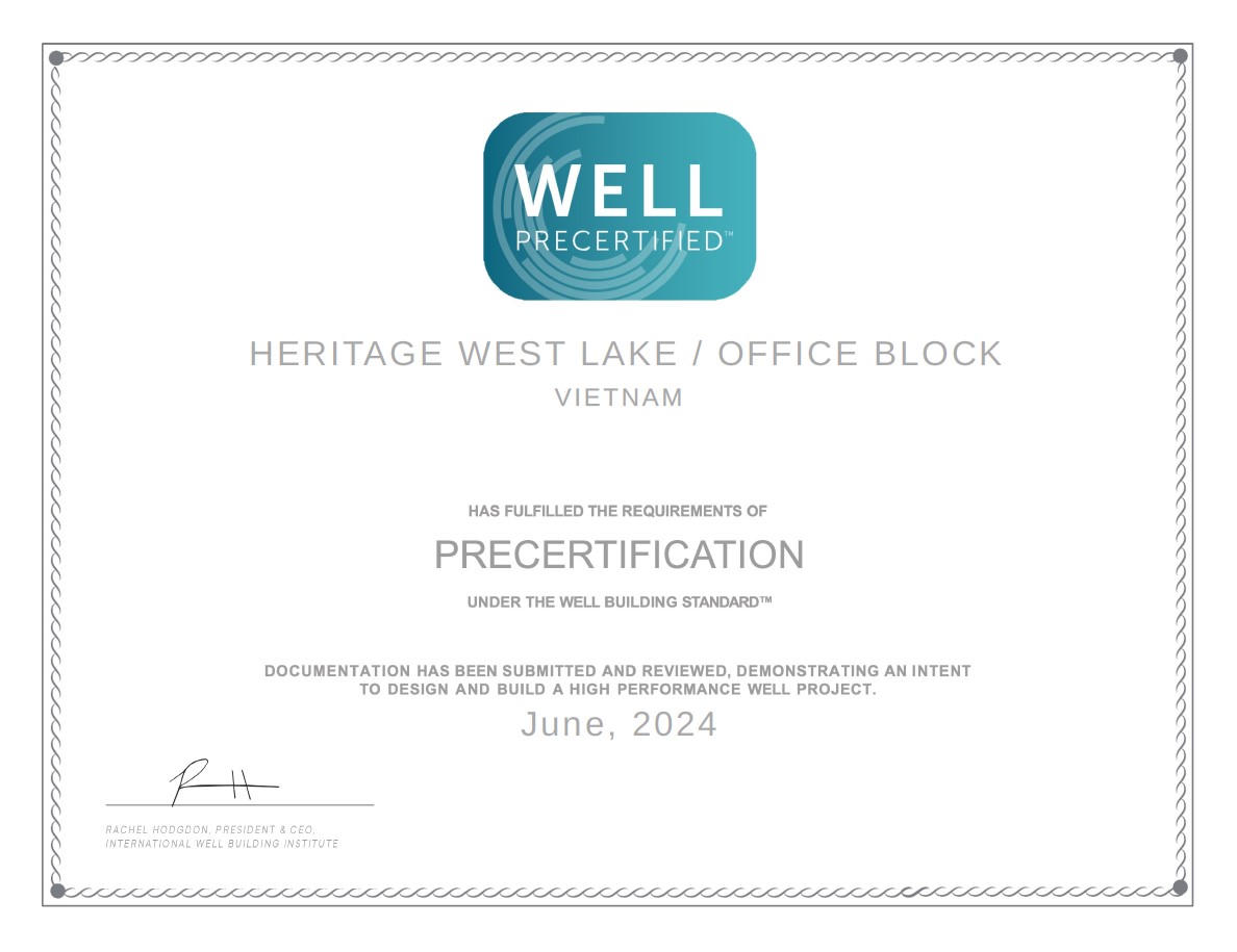 Nằm trong quần thể dự án cao cấp Heritage West Lake, Office Tower @ Heritage West Lake (Office Tower @HWL) đã đánh dấu cột mốc quan trọng khi trở thành tòa văn phòng đầu tiên tại Hà Nội nhận chứng chỉ danh giá WELL Precertification. Để đạt được chứng chỉ này, Office Tower @HWL đã vượt qua 10 tiêu chí khắt khe nhất.
