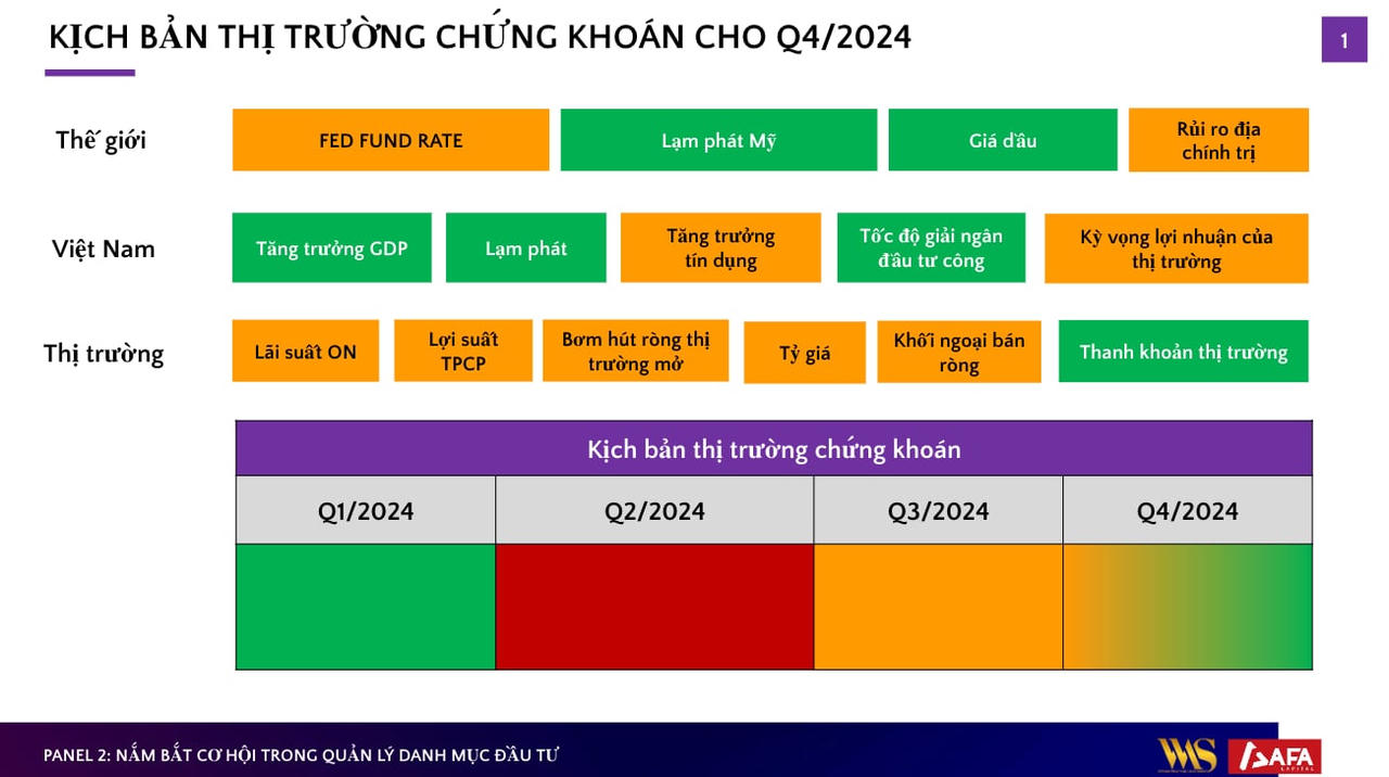 Ông Tuấn nêu cụ thể, biến số thế giới bao gồm các chỉ số của FED và chính sách tiền tệ, lạm phát Mỹ (PCE), giá dầu và rủi ro địa chính trị. Biến số đến từ Việt Nam bao gồm tốc độ tăng trưởng GDP so với kế hoạch, tình hình lạm phát (CPI), tăng trưởng tín dụng, tốc độ tăng trưởng lợi nhuận đạt kỳ vọng của thị trường, tốc độ giải ngân đầu tư công. Và cuối cùng là 6 biến số đến từ thị trường: lãi suất thị trường liên ngân hàng, lãi suất trái phiếu chính phủ 10 năm, tỷ giá, bơm hút ròng thị trường mở, thanh khoản thị trường theo ngày, khối ngoại bán ròng theo tháng.