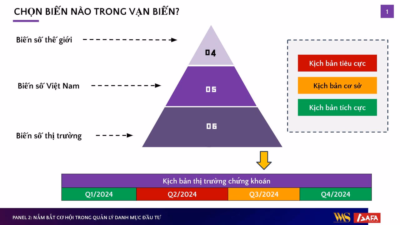 Cụ thể, ông Tuấn nêu 3 biến số quan trọng ảnh hưởng đến môi trường đầu tư đó là biến số thế giới, biến số từ Việt Nam và biến số của thị trường. Đồng thời cần xây dựng 3 kịch bản đó là tích cực, cơ sở và kịch bản tiêu cực. Nhà đầu tư sẽ chủ động được trong việc lựa chọn kênh và tái cơ cấu danh mục đầu tư của mình.