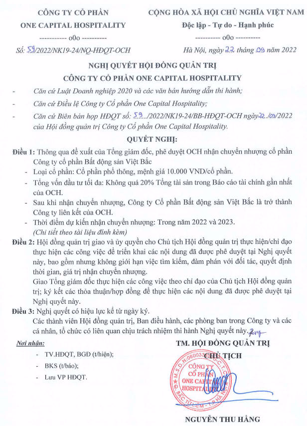 HĐQT CTCP One Capital Hospitality (HNX: OCH) ngày 22/09 thông qua quyết định nhận chuyển nhượng cổ phần CTCP Bất động sản Việt Bắc (Công ty Việt Bắc). Sau khi nhận chuyển nhượng, Công ty Việt Bắc sẽ trở thành công ty liên kết của OCH.