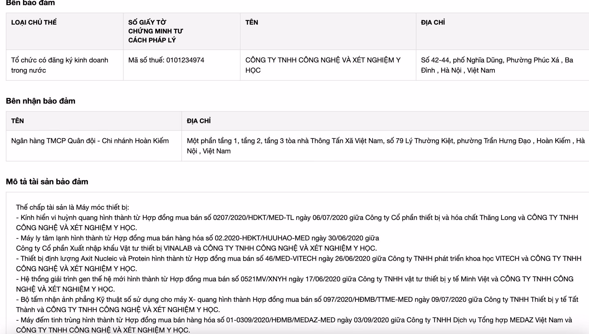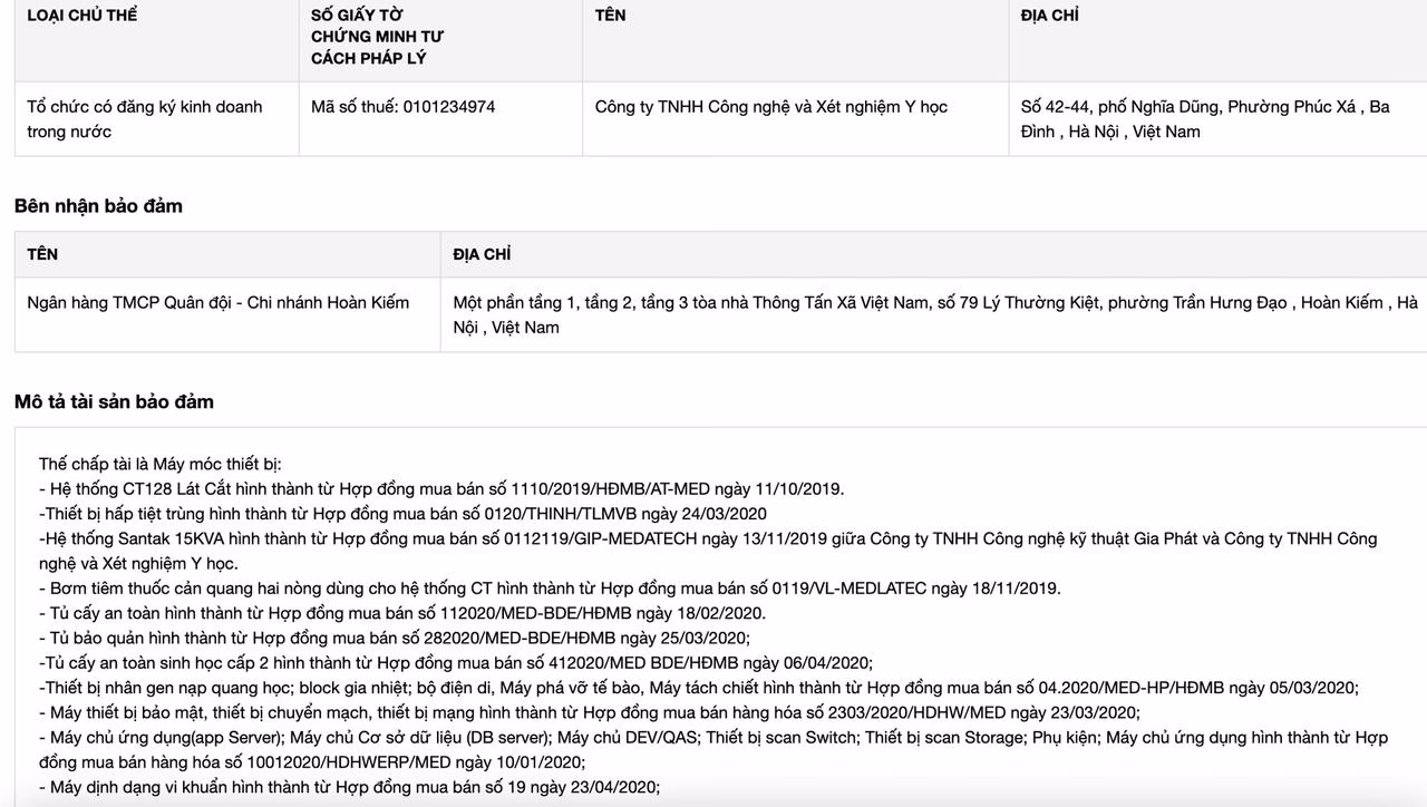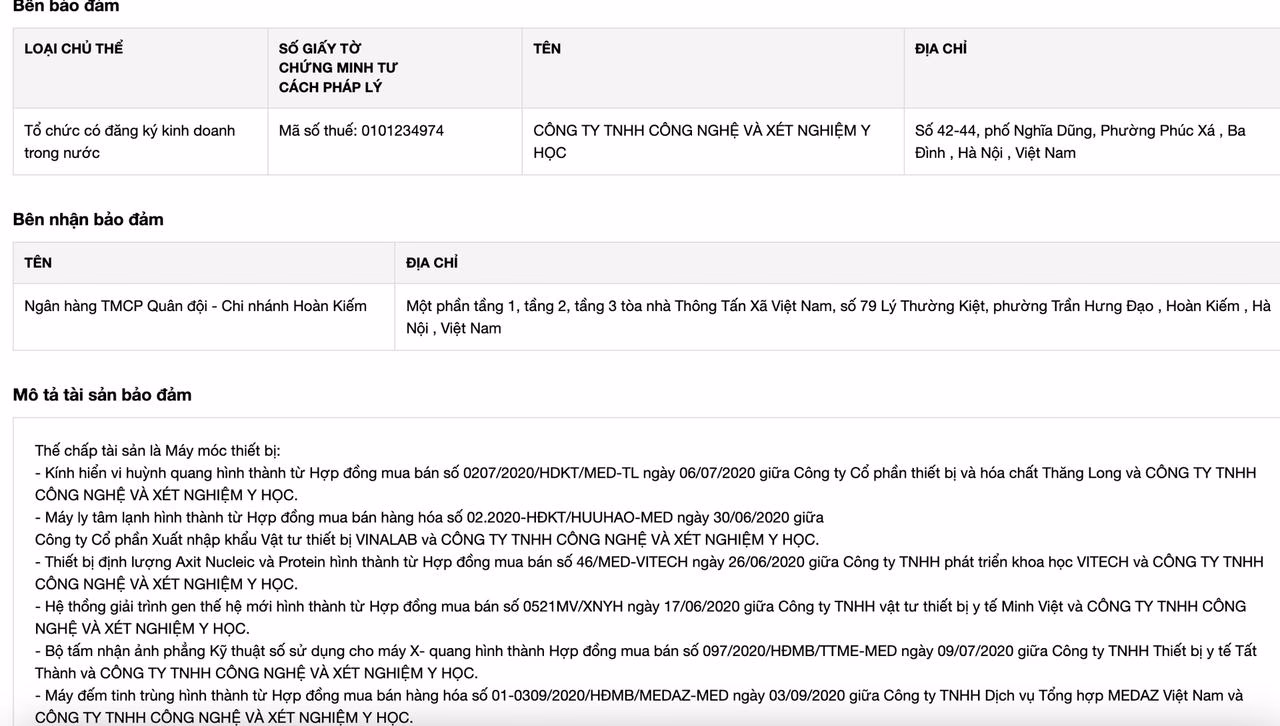 Ngày 7/10/2020, MEDLATEC Việt Nam đã ký 2 hợp đồng vay số: 49300.20.057.4831188.BÐ và 49171.20.057.4831188.BÐ tại Ngân hàng TMCP Quân đội (MB Bank) chi nhánh Hoàn Kiếm, tài sản thế chấp là nhiều máy móc thiết bị.