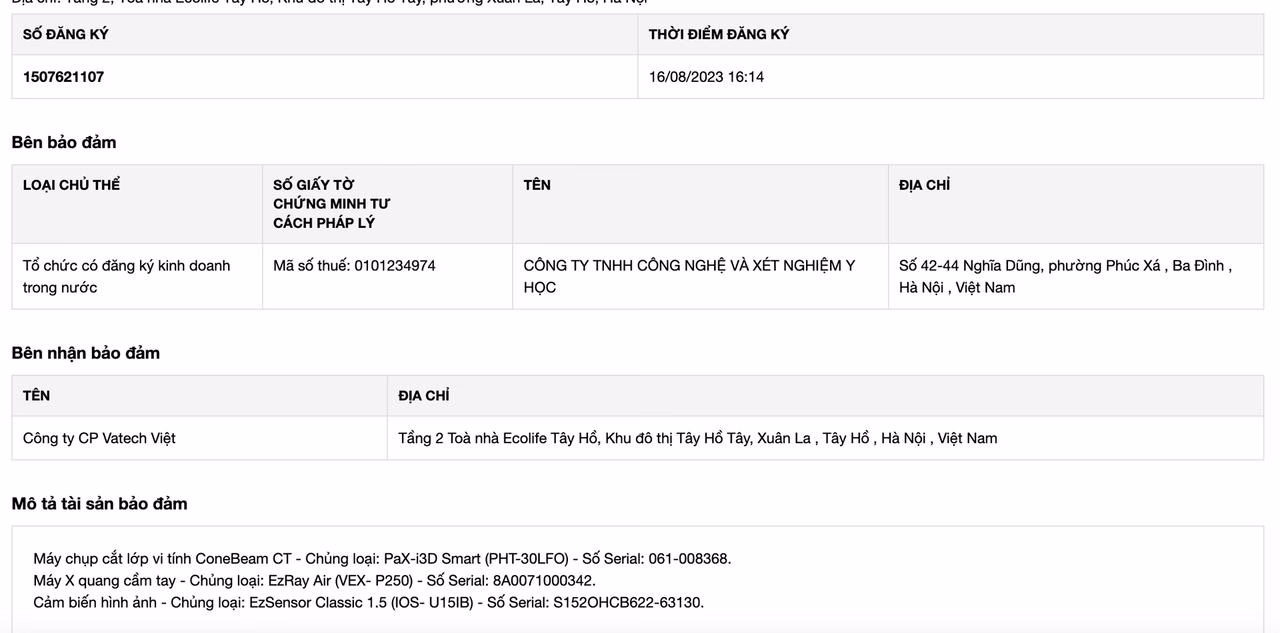 Ngày 16/8/2023, MEDLATEC Việt Nam tiếp tục thế chấp các thiệt bị y tế như: Máy chụp cắt lớp vi tính ConeBeam CT; Máy X quang cầm tay; Cảm biến hình ảnh tại Công ty cổ phần Vatech Việt theo hợp đồng số 2022/VVN-116/HĐMB.