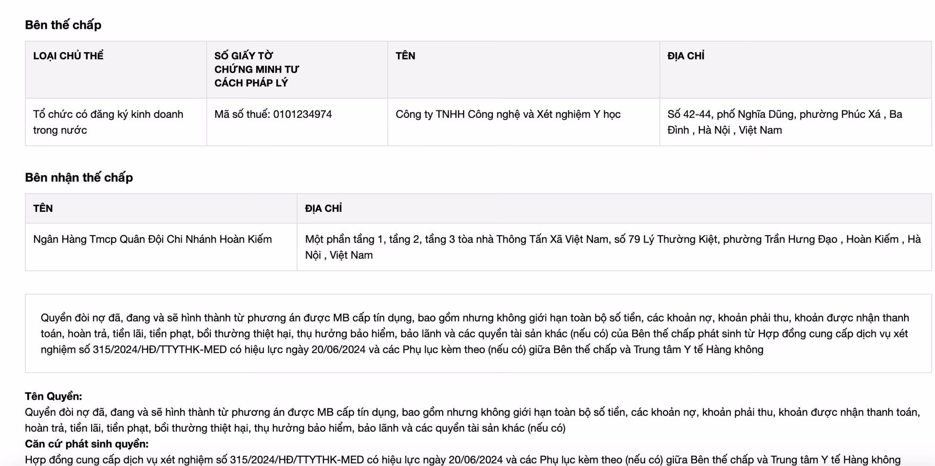 Ngày 25/07/202, MEDLATEC Việt Nam thế chấp Quyền đòi nợ đã, đang và sẽ hình thành từ phương án được MB Bank cấp tín dụng được phát sinh từ Hợp đồng cung cấp dịch vụ xét nghiệm số 315/2024/HĐ/TTYTHK-MED có hiệu lực ngày 20/06/2024 của Trung tâm Y tế Hàng không.
