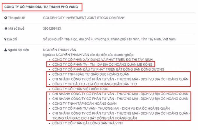 Được biết, Công ty Thành phố Vàng được thành lập vào 15/06/2020 với vốn điều lệ 400 tỷ đồng, hoạt động kinh doanh chính là bất động sản và xây dựng. Đến tháng 8/2020 công ty nhận chuyển nhượng dự án Golden City từ Địa ốc Hoàng Quân. Đáng chú ý, thời điểm này, ông Nguyễn Anh Tuấn vẫn là người đại diện pháp luật của Thành phố Vàng.