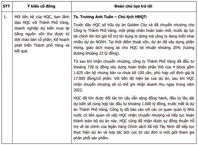 Trước động thái của HQC, nhiều người hoài nghi về thương vụ bán rẻ mua đắt này, ông Trương Anh Tuấn - Chủ tịch HĐQT cho hay: “Trước đây HQC sở hữu dự án Golden City và đã chuyển nhượng cho Công ty Thành Phố Vàng, một pháp nhân hoàn toàn mới, trước áp lực tài chính lớn khi gói hỗ trợ tín dụng bị dừng mà công ty đang triển khai nhiều dự án NOXH. Tại thời điểm thoái vốn, dự án đã xây dựng phần móng, giao dịch mang lại cho HQC lợi nhuận khoảng 20% (tương đương khoảng 23 tỷ đồng)”.