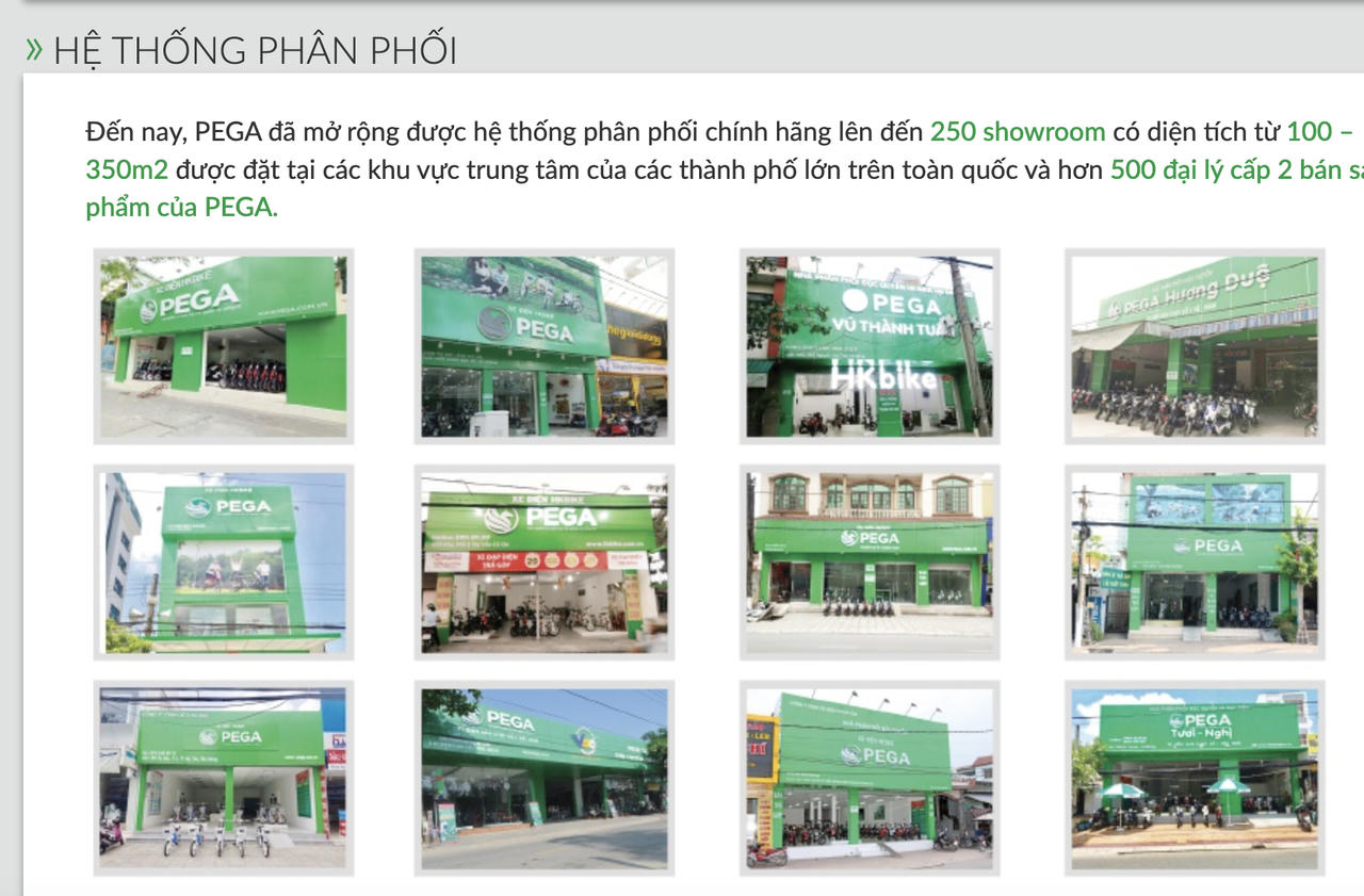 Đến nay, Pega đã mở rộng được hệ thống phân phối chính hãng lên đến 250 showroom có diện tích từ 100 - 350m2 được đặt tại các khu vực trung tâm của các thành phố lớn trên toàn quốc và hơn 500 đại lý cấp 2 bán sản phẩm của Pega.
