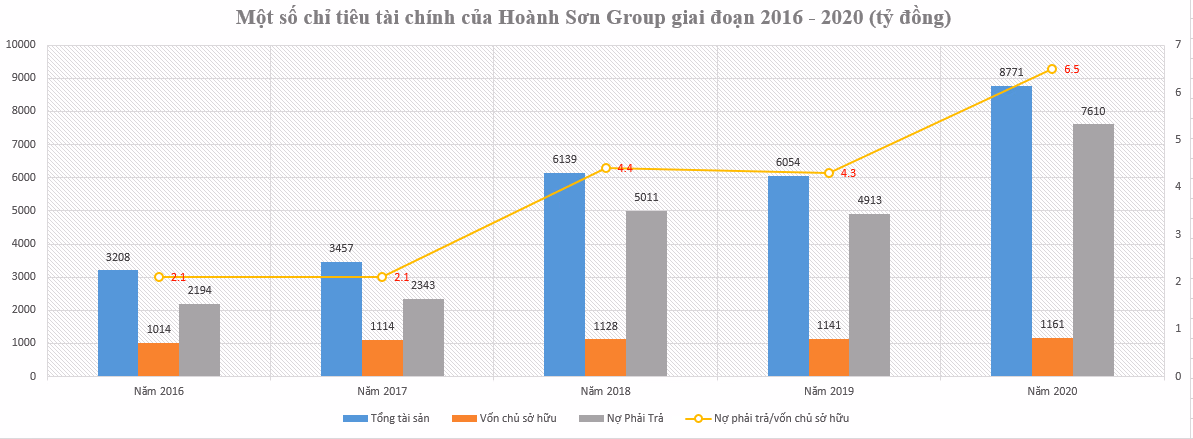 Đáng chú ý khi danh mục nợ phải trả Hoành Sơn Group cũng nhanh chóng "phình to" từ ngưỡng 2.194 tỷ đồng (năm 2016) lên 7.610 tỷ đồng (năm 2020). Hệ số nợ phải trở/vốn chủ sở hữu đến cuối năm ngoái là 6,5 lần.