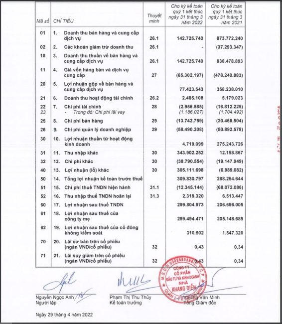 Theo Báo cáo tài chính quý I/2022 vừa được CTCP Đầu tư và Kinh doanh Nhà Khang Điền công bố, doanh nghiệp ghi nhận doanh thu thuần 143 tỷ đồng, giảm 83% so với cùng kỳ. Khoản doanh thu từ chuyển nhượng bất động sản cũng giảm 85% còn 129 tỷ đồng.