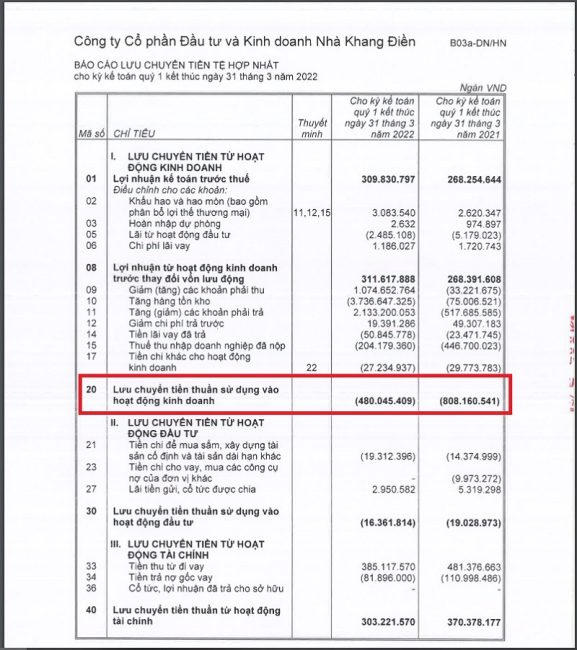 Cụ thể, tính đến ngày 31/3/2022 lưu chuyển tiền thuần vào hoạt động kinh doanh của KDH âm hơn 480 tỷ đồng (giảm gần 50% so với cùng kỳ năm trước).