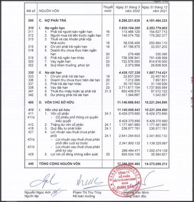 Tính đến ngày 31/3/2022 Nhà Khang Điền sở hữu tổng nguồn vốn 17.400 tỷ đồng. Trong đó, vốn chủ sở hữu là 11.140 tỷ đồng, còn lại là 6.256 tỷ đồng nợ phải trả.