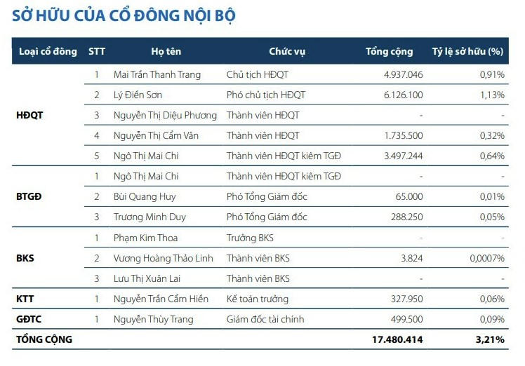 Trong đó, đáng chú là ông Lý Điền Sơn – người từng đảm nhiệm vị trí Chủ tịch HĐQT kiêm Tổng Giám đốc. Đến cuối tháng 3/2017, ông Sơn đã từ nhiệm chức danh Tổng Giám đốc để nhường lại cho bà Ngô Thị Mai Chi. Trước đó, ông Sơn cũng đã từ nhiệm vị trí Chủ tịch HĐQT cho người khác để lùi xuống vị trí Phó Chủ tịch.