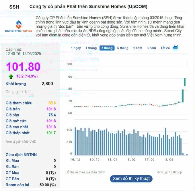 Phiên giao dịch ngày 14/3, cổ phiếu CTCP Phát triển Sunshine Homes (UPCoM: SSH) tăng trần phiên thứ 3 liên tiếp, lên 101.800 đồng/cp. Giá trị SSH đã tăng 46% kể từ đầu tuần, giúp vốn hóa công ty lên 33.713 tỷ đồng.