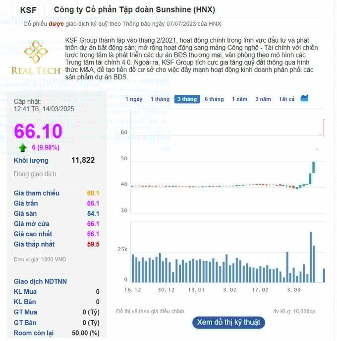 Đồng thời, cổ phiếu CTCP Tập đoàn Sunshine (HNX: KSF) tiếp tục tăng trần đạt 66.100 đồng/cp. Đây là phiên tăng trần thứ 5 liên tiếp. Thanh khoản đạt 11.800 đơn vị, giá trị giao dịch gần 1 tỷ đồng, KSF đã tăng 60% thị giá (tính từ đầu tuần), đưa vốn hóa công ty lên 18.030 tỷ đồng.