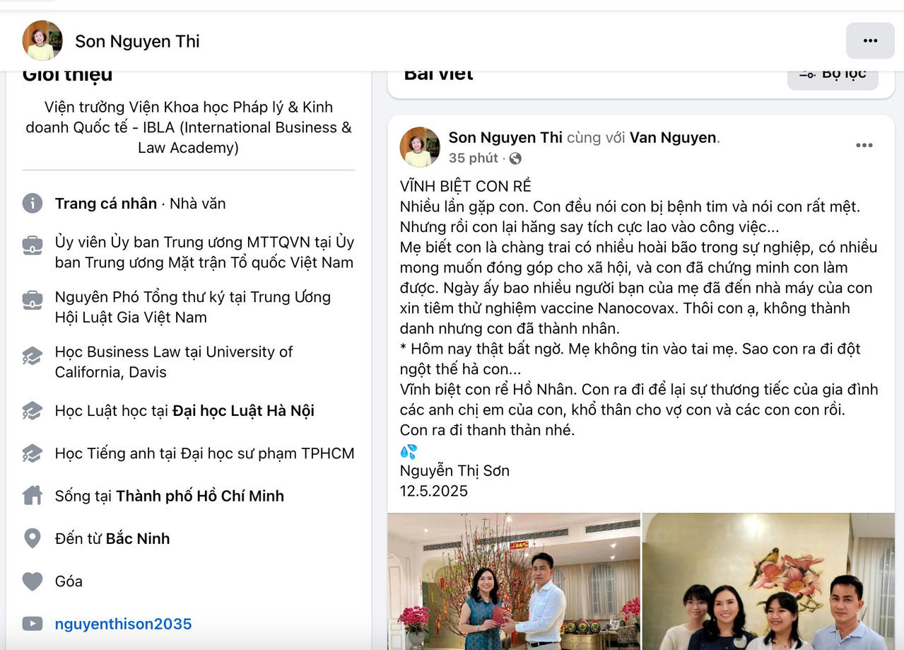 "Mẹ biết con là chàng trai có nhiều hoài bão trong sự nghiệp, có nhiều mong muốn đóng góp cho xã hội, và con đã chứng minh con làm được. Ngày ấy bao nhiều người bạn của mẹ đã đến nhà máy của con xin tiêm thử nghiệm vaccine Nanocovax. Thôi con ạ, không thành danh nhưng con đã thành nhân", bà Sơn viết.