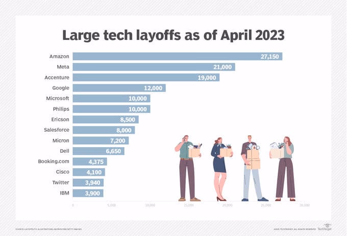 Ngành công nghệ là một trong những chịu ảnh hưởng nặng nề nhất trong làn sóng cắt giảm. Theo Layoffs.fyi, tính đến tháng 12 năm 2023, có đến 1.157 công ty công nghệ đã sa thải tổng cộng 257.778 nhân viên. Các gã khổng lồ như Google, Amazon, Meta... cũng không thoát khỏi tình trạng này, với số lượng cắt giảm lên đến hàng chục ngàn người.